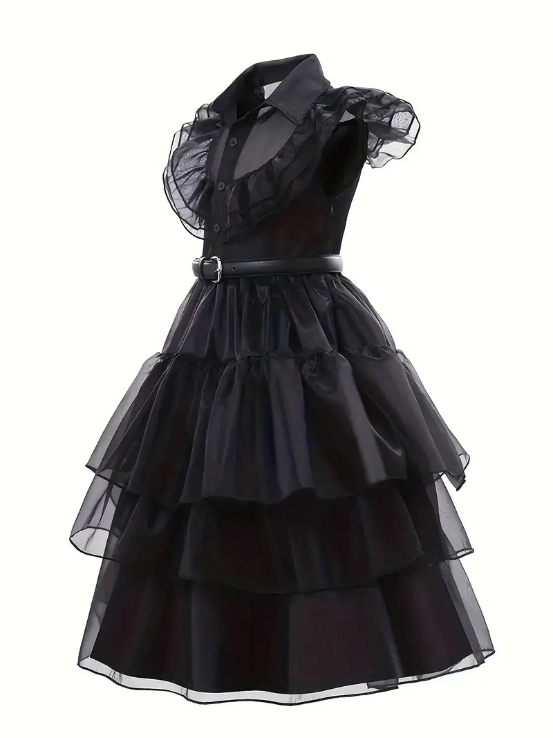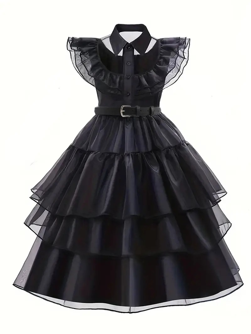 Girls Dress Set Sleeveless Ruffle Princess Dress & Wig & Socks & Gloves Dark Style Halloween Party